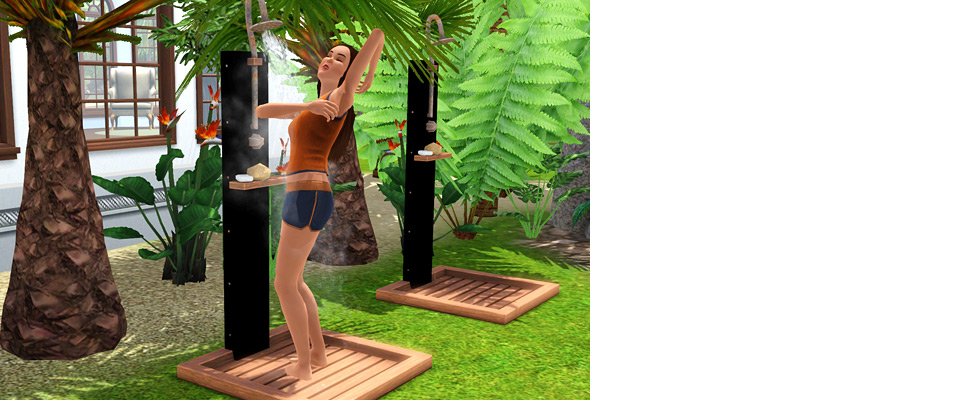 ¡Dúchate fuera y di adiós al vapor en los espejos! ¡Esta ducha exterior añade diversión a tu aseo personal y ya puede adquirirse de manera individual en Los Sims 3 Store!